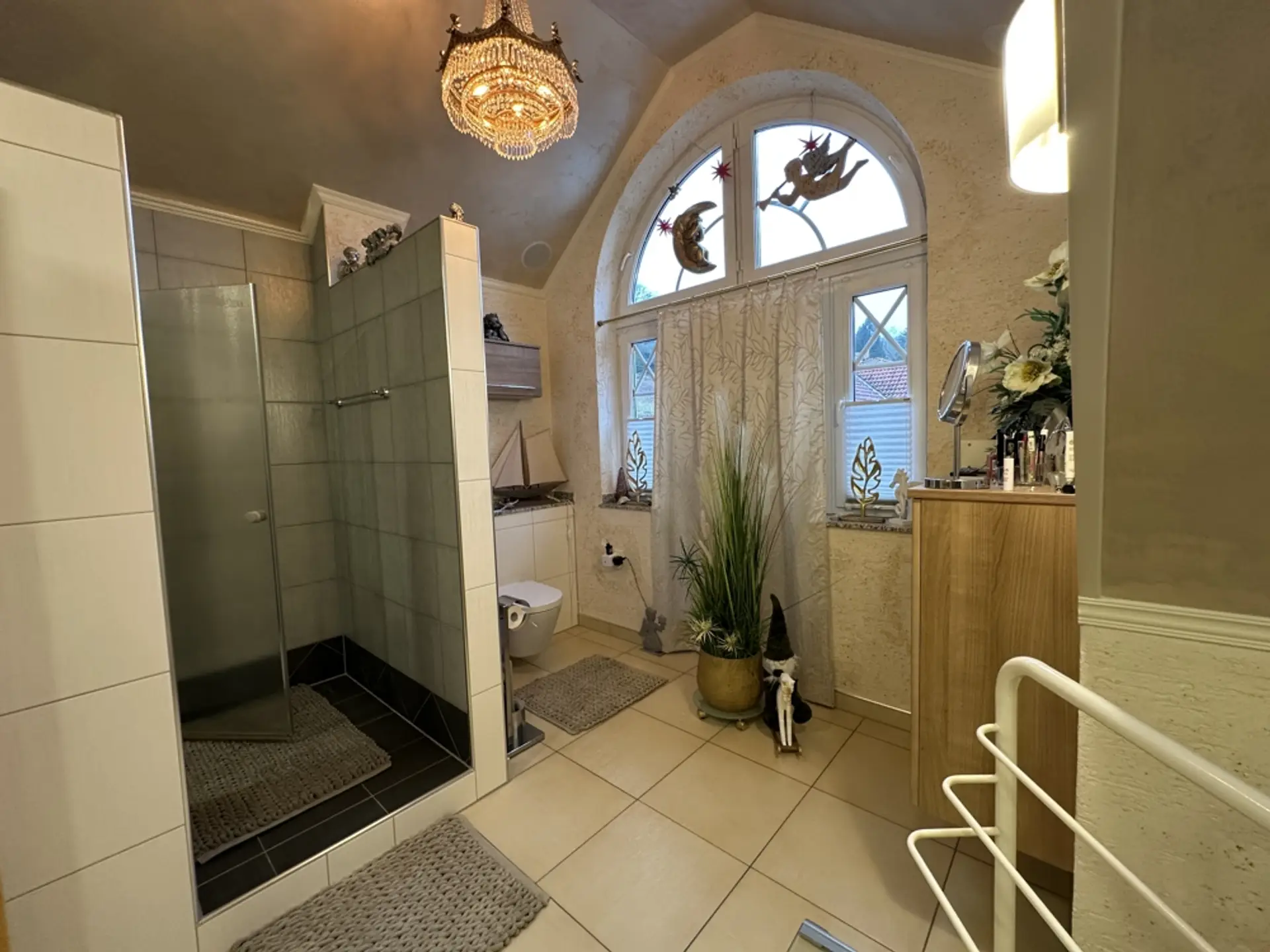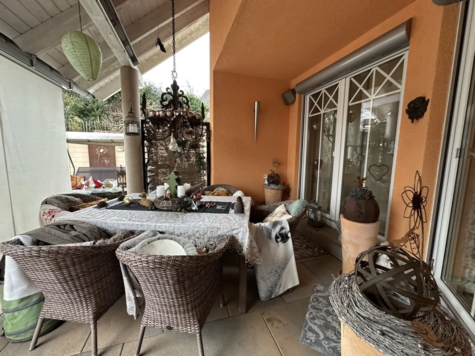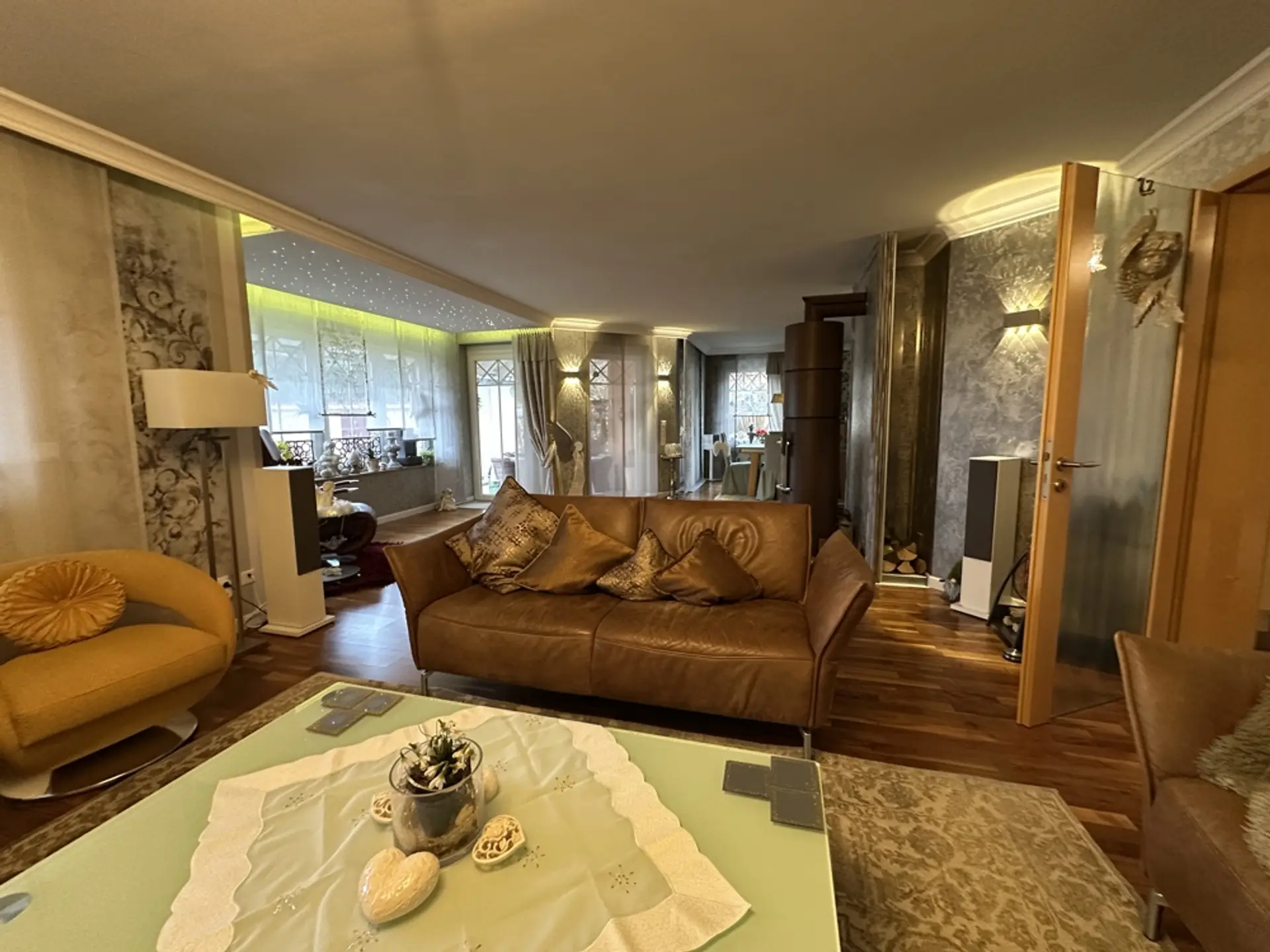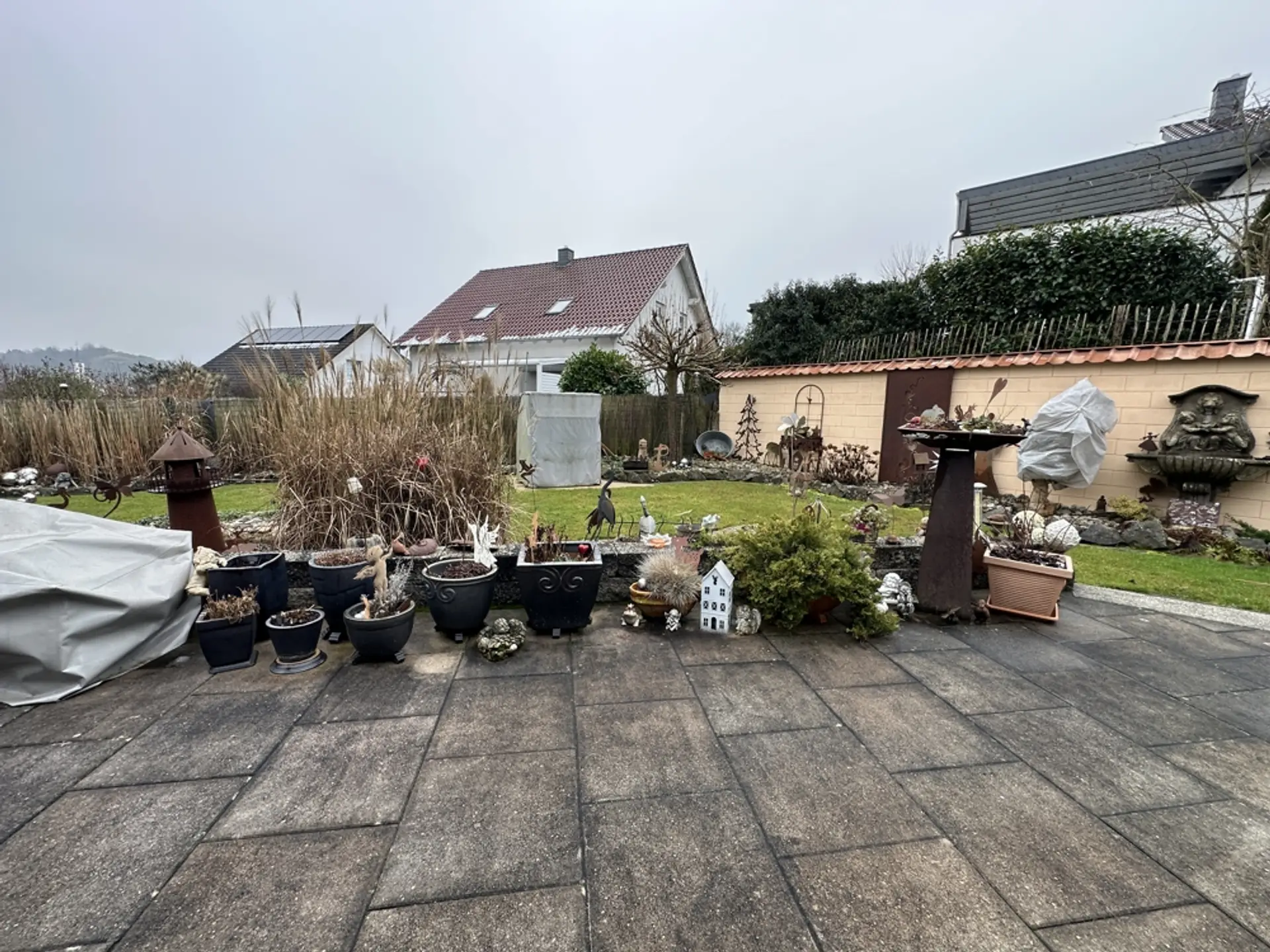 Hauswirtschaftsraum und Heizungsraum Im HWR befindet sich die elektrische Pumpe für die 10.000-Liter-Zisterne (zur Speisung der Außenzapfstellen). Zudem sind eine Entkalkungsanlage für Weichwasser und eine Rückstauklappe installiert. Ein erhöhtes Podest für die Waschmaschine erleichtert das Be- und Entladen. Vorhanden sind ein Putzwaschbecken und ausreichend Platz zum Wäschetrocknen. Regale sind hinter Vorhängen verborgen; Dekoration mit Blechschildern. Im Schaltschrank befinden sich alle Zähler und Sicherungen für das gesamte Anwesen (Haus, ELW, Garten, Garage). Sauna (vor 3 Jahren renoviert) Um in einem Feuchtraum wie der Sauna ein gesundes Klima zu garantieren, wurden die Wände mit einem reinen mineralischen Putz („Pure“) veredelt. Dieser Spezialputz ist essenziell für die Bausubstanz: Er nimmt die hohe Luftfeuchtigkeit, die beim Saunieren entsteht, auf und gibt sie kontrolliert wieder ab. Dies dient als aktive Schimmelprävention und sorgt für eine dauerhaft gesunde und geruchsneutrale Umgebung. Unterstützt wird das Klima durch drei Fenster (zwei kleine, ein großes), die sich sowohl kippen als auch komplett öffnen lassen, um eine schnelle Querlüftung zu ermöglichen. Garage (vor 6 Jahren renoviert) Die Garage ist umfassend wärmegedämmt. Dies umfasst den Boden, die Decke sowie zusätzlich die Seitenwände an der Torfront und die Stirnwand. Durch die Isolierung hält die Garage im Winter eine konstante Temperatur (ca. 10 Grad/frostfrei). Sie eignet sich dadurch hervorragend zum Überwintern empfindlicher Pflanzen. Sichtflächen in modernem Spezialputz (Betonoptik). Graues Feinsteinzeug. Treppe mit edlem Schwarz-Weiß-Granit. Die Garage wurde architektonisch so geplant, dass sie sich schnell in einen Partyraum verwandeln lässt. Der Garten ist in drei Ebenen aufgeteilt und so angeordnet, dass durch verschiedene Sitzplätze zu jeder Tageszeit (Sonne oder Schatten) der perfekte Aufenthaltsort zur Verfügung steht. Ein Erdtank mit 10.000 Litern Fassungsvermögen speist das System. Die Beleuchtung setzt den Garten abends in Szene und ist zentral steuerbar.
