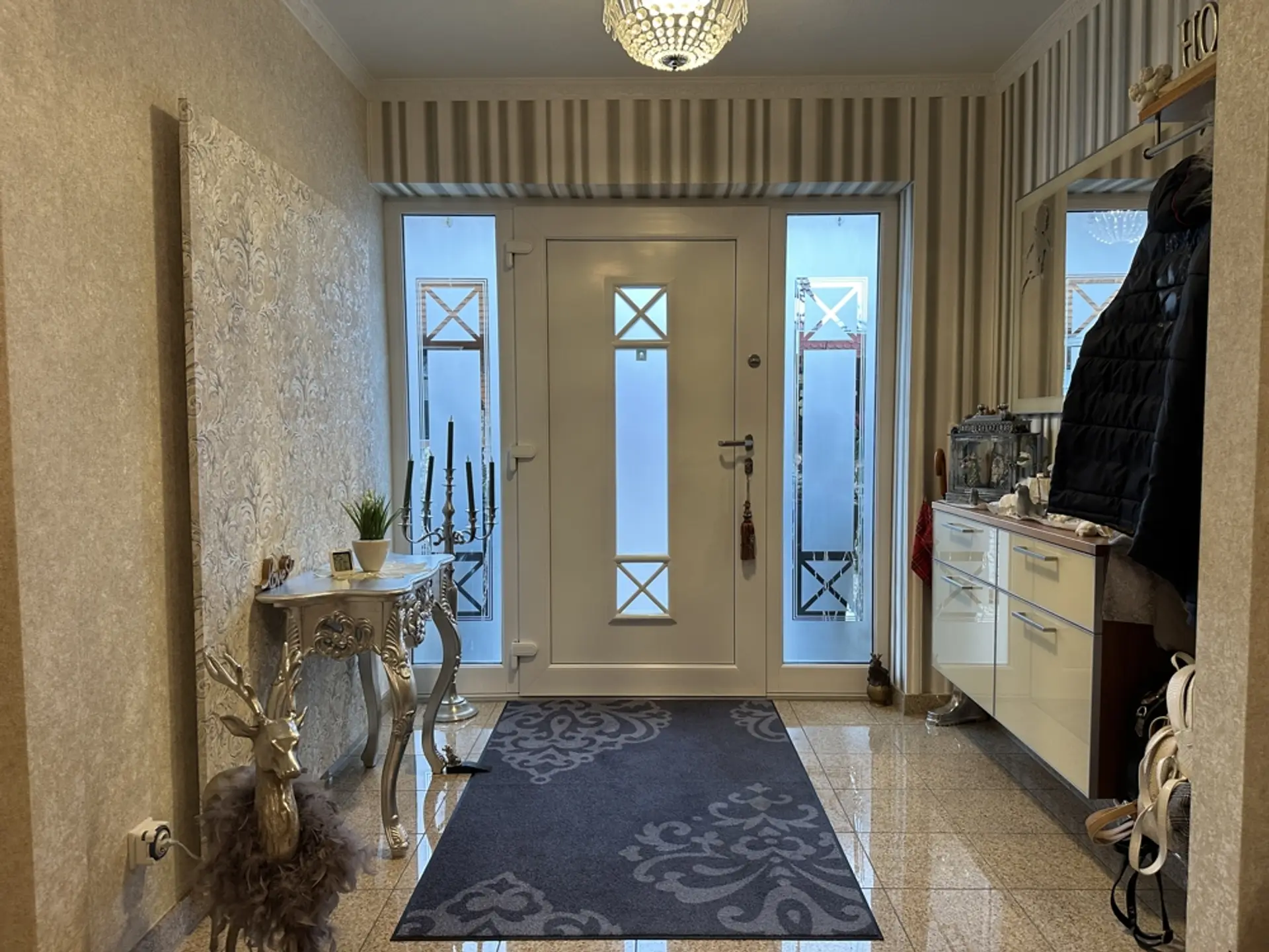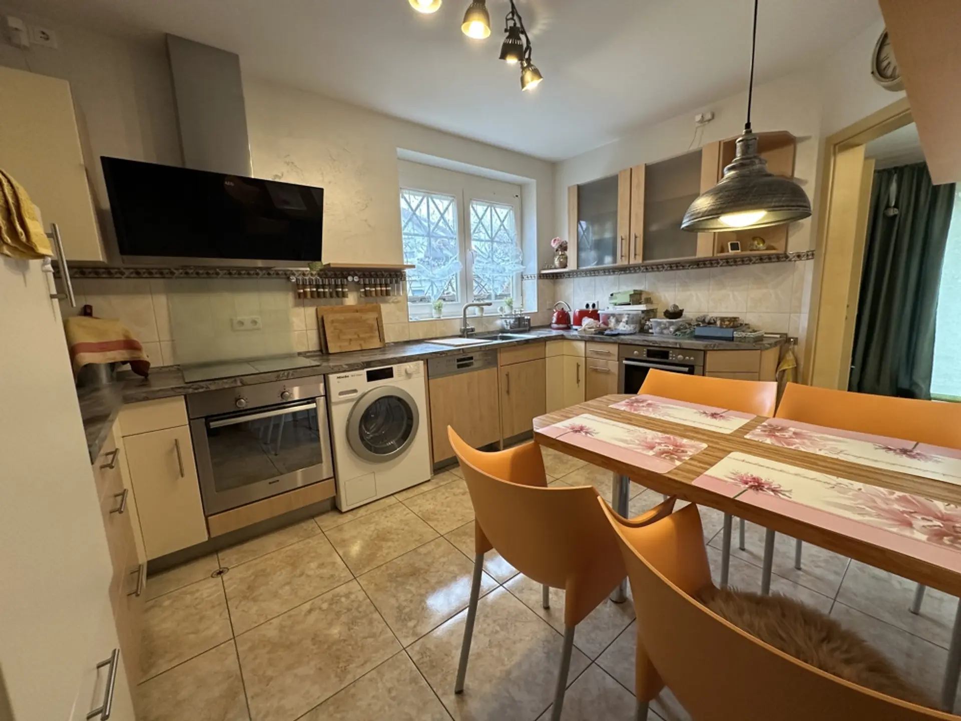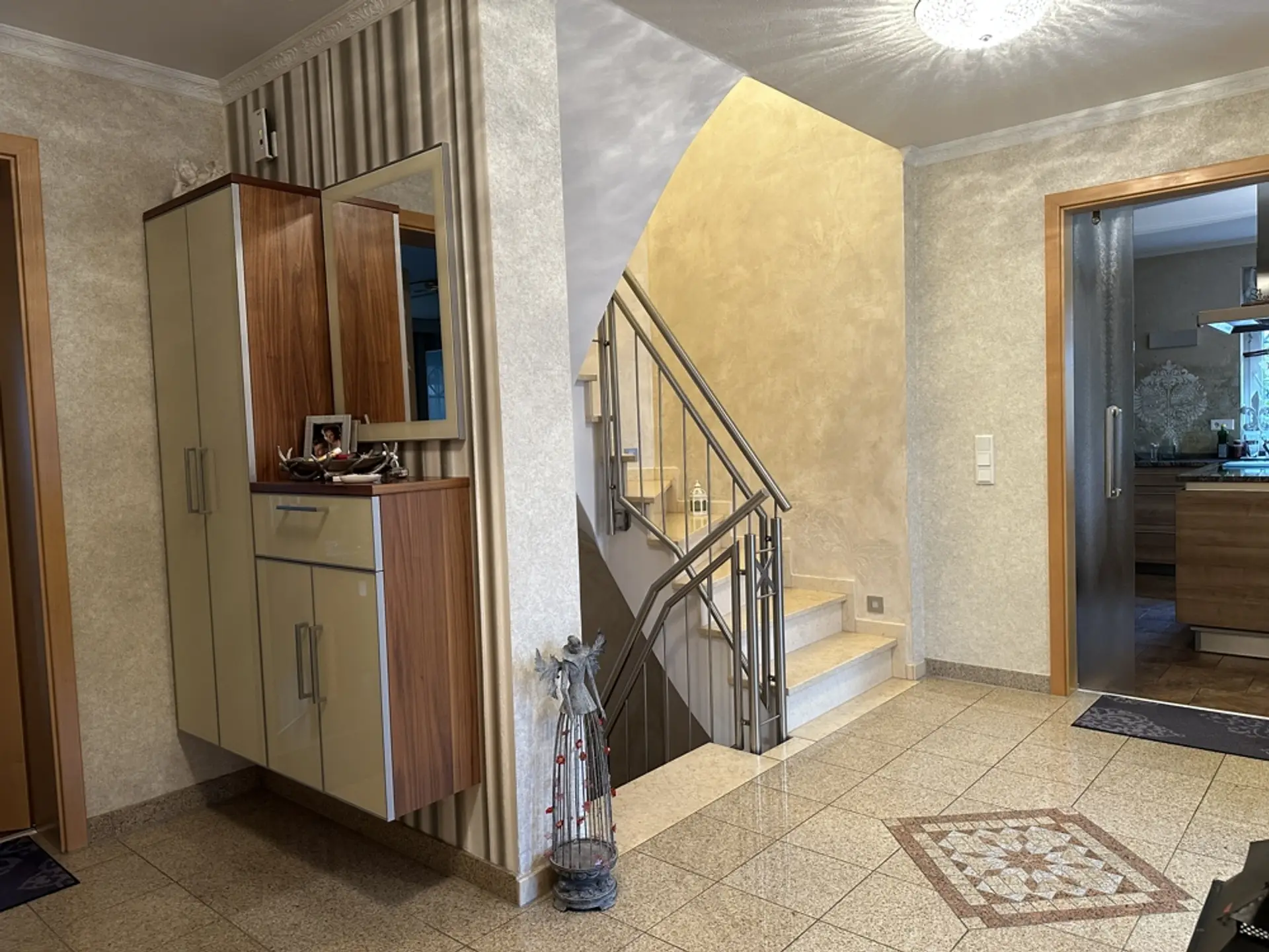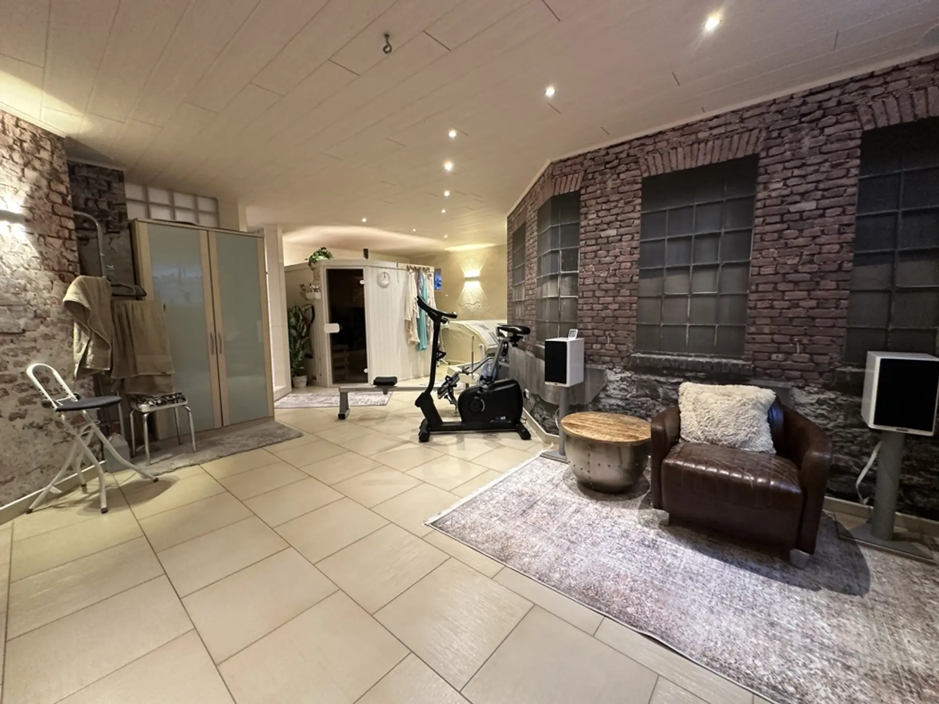 Hauswirtschaftsraum und Heizungsraum Im HWR befindet sich die elektrische Pumpe für die 10.000-Liter-Zisterne (zur Speisung der Außenzapfstellen). Zudem sind eine Entkalkungsanlage für Weichwasser und eine Rückstauklappe installiert. Ein erhöhtes Podest für die Waschmaschine erleichtert das Be- und Entladen. Vorhanden sind ein Putzwaschbecken und ausreichend Platz zum Wäschetrocknen. Regale sind hinter Vorhängen verborgen; Dekoration mit Blechschildern. Im Schaltschrank befinden sich alle Zähler und Sicherungen für das gesamte Anwesen (Haus, ELW, Garten, Garage). Sauna (vor 3 Jahren renoviert) Um in einem Feuchtraum wie der Sauna ein gesundes Klima zu garantieren, wurden die Wände mit einem reinen mineralischen Putz („Pure“) veredelt. Dieser Spezialputz ist essenziell für die Bausubstanz: Er nimmt die hohe Luftfeuchtigkeit, die beim Saunieren entsteht, auf und gibt sie kontrolliert wieder ab. Dies dient als aktive Schimmelprävention und sorgt für eine dauerhaft gesunde und geruchsneutrale Umgebung. Unterstützt wird das Klima durch drei Fenster (zwei kleine, ein großes), die sich sowohl kippen als auch komplett öffnen lassen, um eine schnelle Querlüftung zu ermöglichen. Garage (vor 6 Jahren renoviert) Die Garage ist umfassend wärmegedämmt. Dies umfasst den Boden, die Decke sowie zusätzlich die Seitenwände an der Torfront und die Stirnwand. Durch die Isolierung hält die Garage im Winter eine konstante Temperatur (ca. 10 Grad/frostfrei). Sie eignet sich dadurch hervorragend zum Überwintern empfindlicher Pflanzen. Sichtflächen in modernem Spezialputz (Betonoptik). Graues Feinsteinzeug. Treppe mit edlem Schwarz-Weiß-Granit. Die Garage wurde architektonisch so geplant, dass sie sich schnell in einen Partyraum verwandeln lässt. Der Garten ist in drei Ebenen aufgeteilt und so angeordnet, dass durch verschiedene Sitzplätze zu jeder Tageszeit (Sonne oder Schatten) der perfekte Aufenthaltsort zur Verfügung steht. Ein Erdtank mit 10.000 Litern Fassungsvermögen speist das System. Die Beleuchtung setzt den Garten abends in Szene und ist zentral steuerbar.
