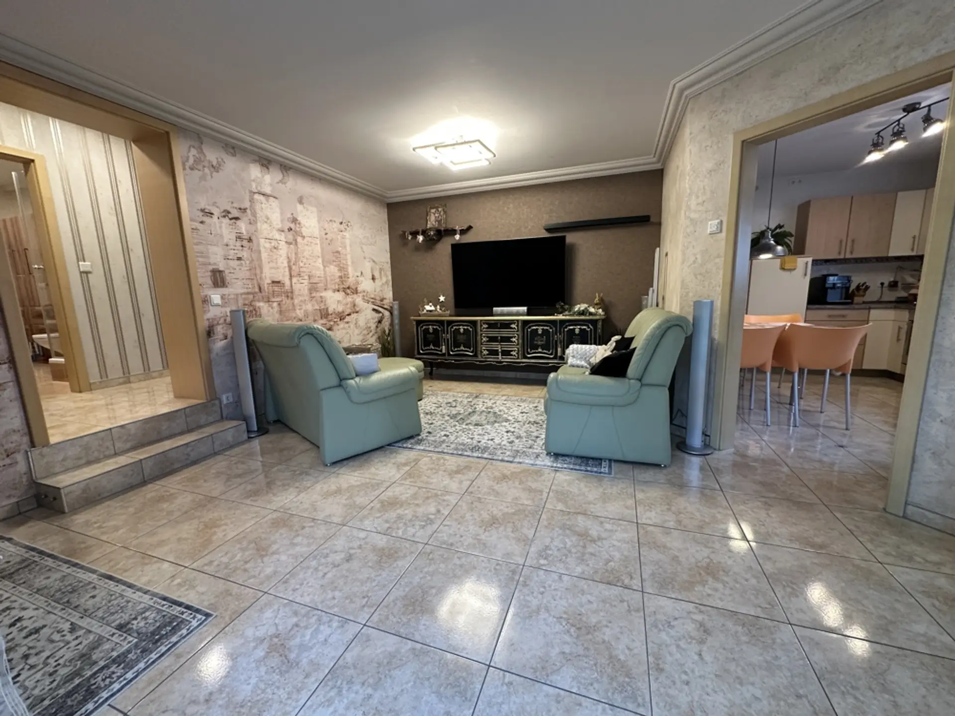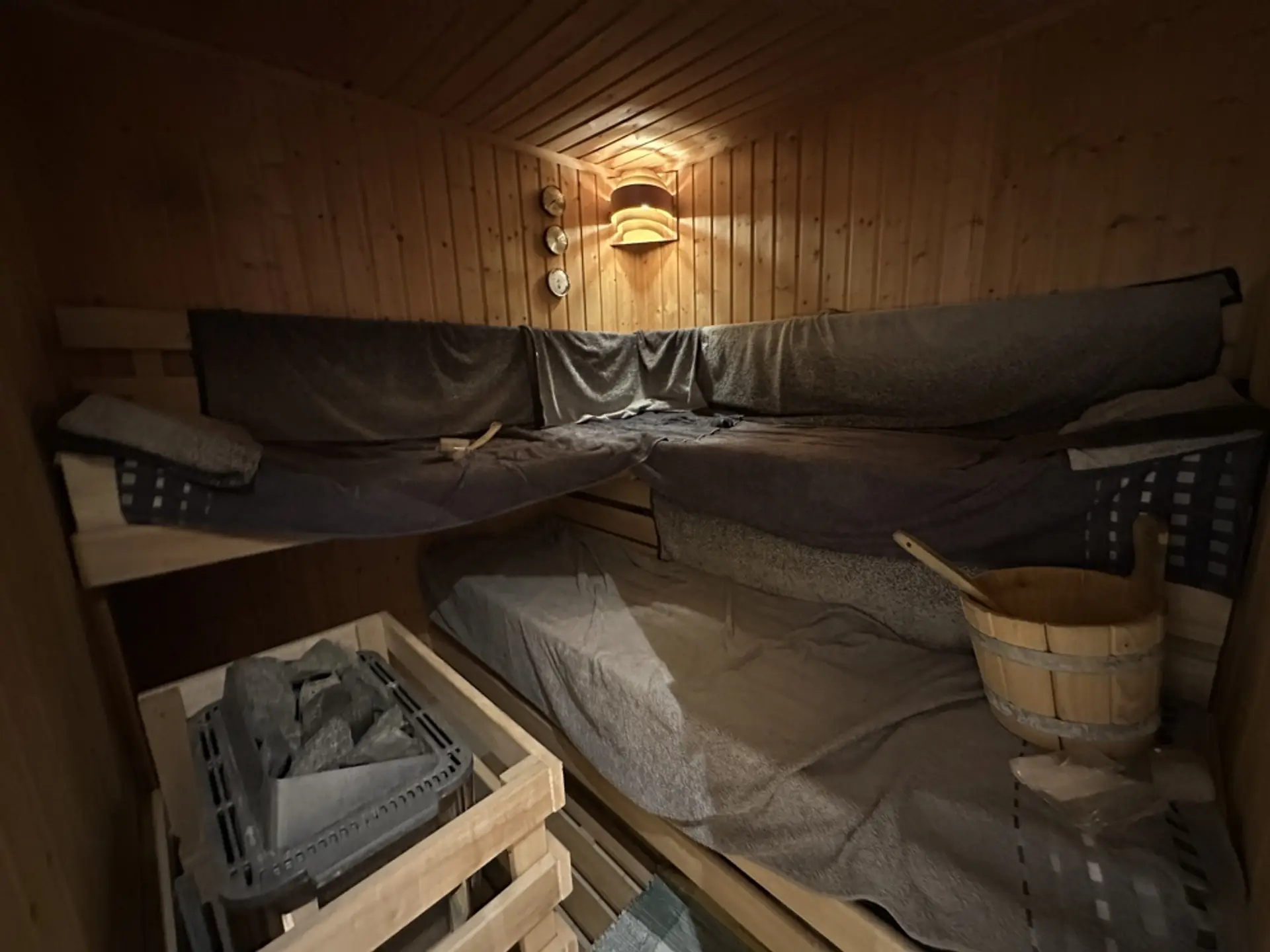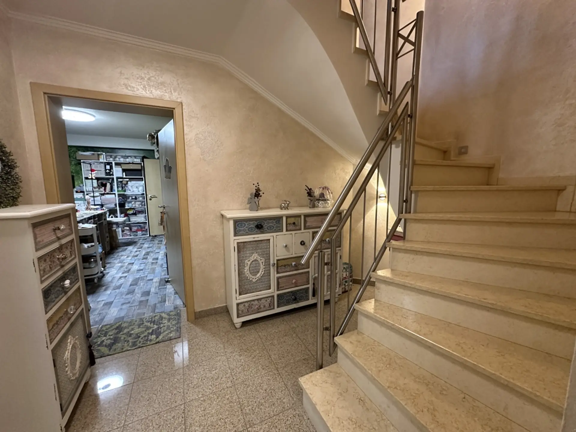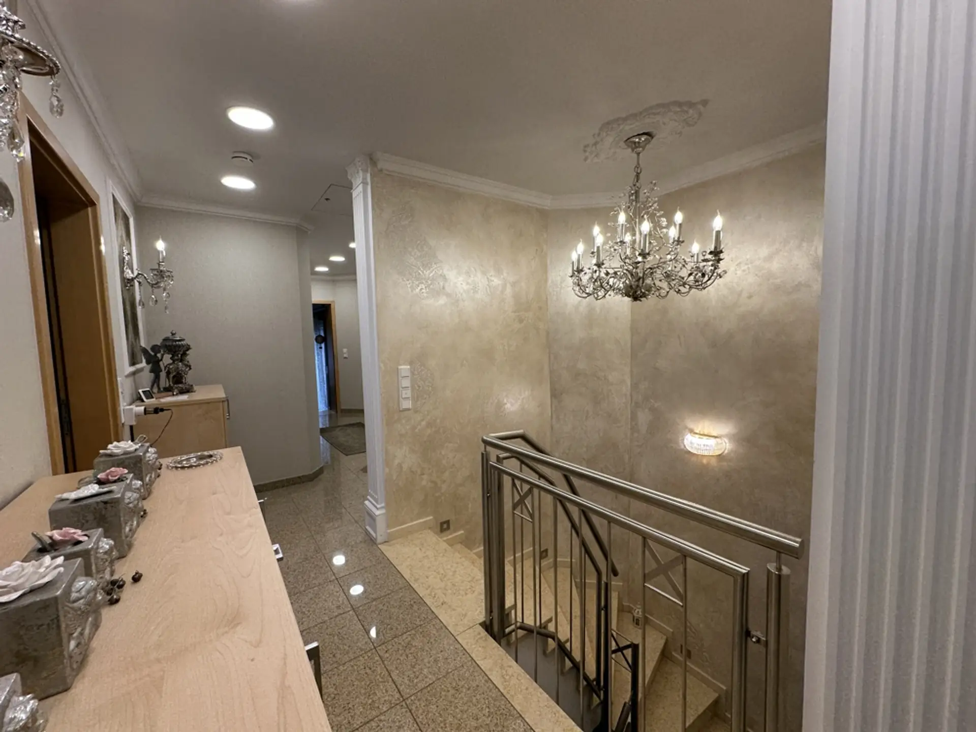 Hauswirtschaftsraum und Heizungsraum Im HWR befindet sich die elektrische Pumpe für die 10.000-Liter-Zisterne (zur Speisung der Außenzapfstellen). Zudem sind eine Entkalkungsanlage für Weichwasser und eine Rückstauklappe installiert. Ein erhöhtes Podest für die Waschmaschine erleichtert das Be- und Entladen. Vorhanden sind ein Putzwaschbecken und ausreichend Platz zum Wäschetrocknen. Regale sind hinter Vorhängen verborgen; Dekoration mit Blechschildern. Im Schaltschrank befinden sich alle Zähler und Sicherungen für das gesamte Anwesen (Haus, ELW, Garten, Garage). Sauna (vor 3 Jahren renoviert) Um in einem Feuchtraum wie der Sauna ein gesundes Klima zu garantieren, wurden die Wände mit einem reinen mineralischen Putz („Pure“) veredelt. Dieser Spezialputz ist essenziell für die Bausubstanz: Er nimmt die hohe Luftfeuchtigkeit, die beim Saunieren entsteht, auf und gibt sie kontrolliert wieder ab. Dies dient als aktive Schimmelprävention und sorgt für eine dauerhaft gesunde und geruchsneutrale Umgebung. Unterstützt wird das Klima durch drei Fenster (zwei kleine, ein großes), die sich sowohl kippen als auch komplett öffnen lassen, um eine schnelle Querlüftung zu ermöglichen. Garage (vor 6 Jahren renoviert) Die Garage ist umfassend wärmegedämmt. Dies umfasst den Boden, die Decke sowie zusätzlich die Seitenwände an der Torfront und die Stirnwand. Durch die Isolierung hält die Garage im Winter eine konstante Temperatur (ca. 10 Grad/frostfrei). Sie eignet sich dadurch hervorragend zum Überwintern empfindlicher Pflanzen. Sichtflächen in modernem Spezialputz (Betonoptik). Graues Feinsteinzeug. Treppe mit edlem Schwarz-Weiß-Granit. Die Garage wurde architektonisch so geplant, dass sie sich schnell in einen Partyraum verwandeln lässt. Der Garten ist in drei Ebenen aufgeteilt und so angeordnet, dass durch verschiedene Sitzplätze zu jeder Tageszeit (Sonne oder Schatten) der perfekte Aufenthaltsort zur Verfügung steht. Ein Erdtank mit 10.000 Litern Fassungsvermögen speist das System. Die Beleuchtung setzt den Garten abends in Szene und ist zentral steuerbar.